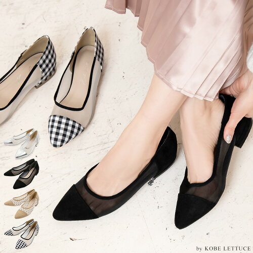 チュールコンビフラットヒールパンプス レディース シュース ローヒール ぺたんこ 黒 ブラック 秋 パンプス 痛くない ブラック フラットシューズ ポインテッドトゥ チュール ドット ドットチュール チェック シルバー [I1738]【入荷済】